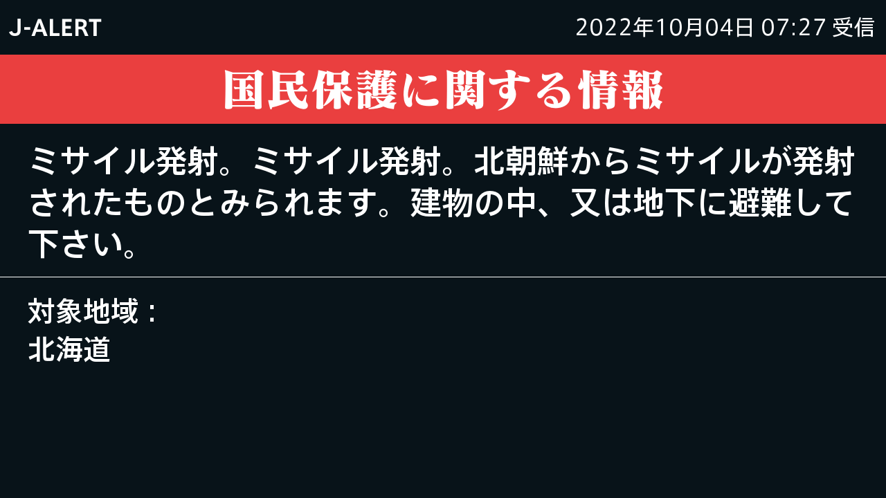 特務機関nerv On Twitter 国民保護に関する情報 J Alert ミサイル発射 ミサイル発射 北朝鮮からミサイルが発射されたものとみられます 建物の中 又は地下に避難して下さい 対象地域 北海道 Https T Co Ijc8twnmn3 Twitter